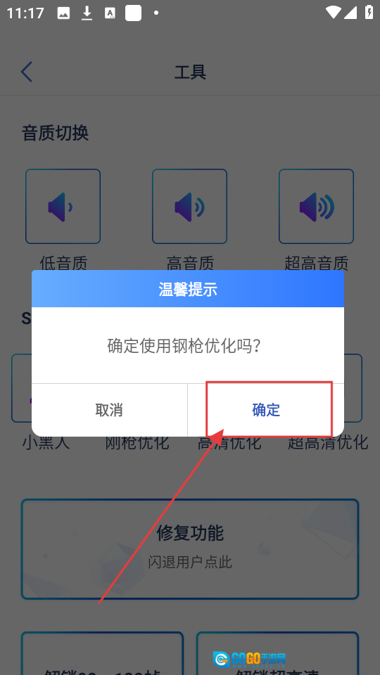 点击该按钮后会弹出温馨提示窗口,询问是否确认启用刚枪优化功能,点击【确定】按钮即可开启优化。