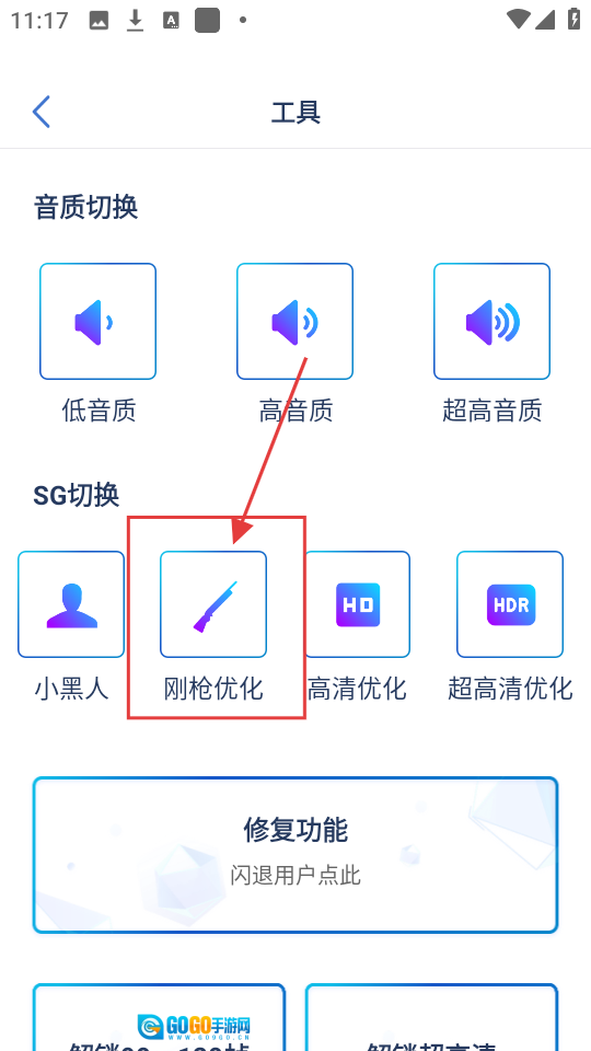 进入工具页面后,会看到SG切换的选项,要是想进行刚枪优化,点击【刚枪优化】选项即可。