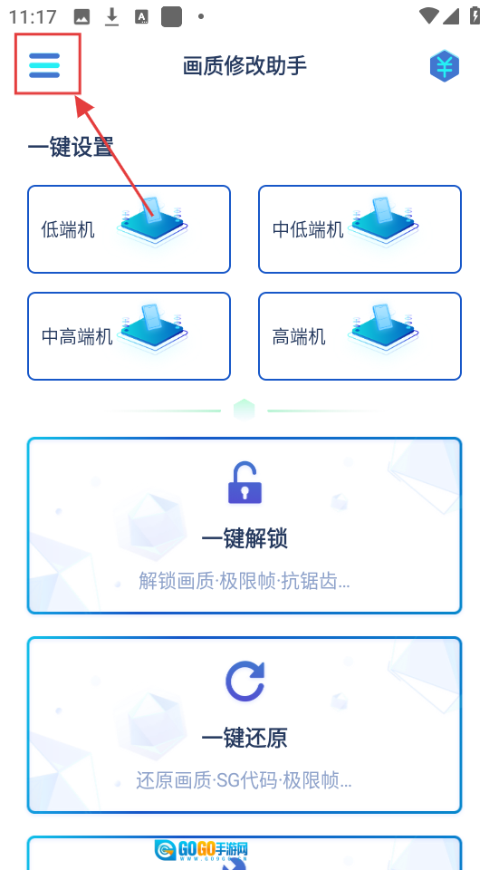 打开画质修改助手后,要是想找工具,就点击左上角的菜单按钮,展开菜单查看一下。