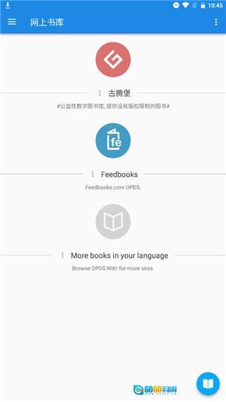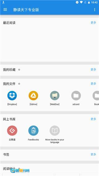 软件主页整合了本地与云端资源,你不仅能浏览手机里的书,还能通过网上书店发现像古腾堡这样的免费外文书籍。