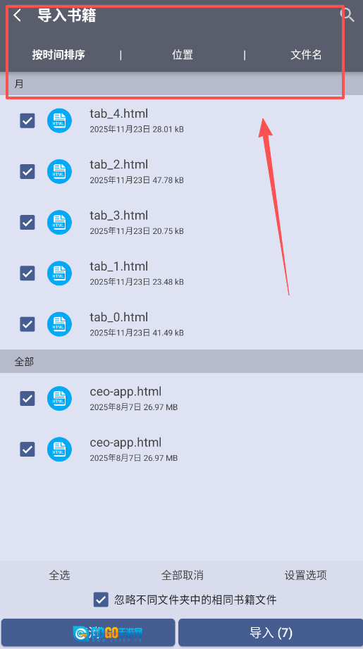 书籍导入界面支持多种排序方式,勾选文件后,借助全选功能以及设置里的忽略重复文件夹选项,能够高效地批量导入新书。