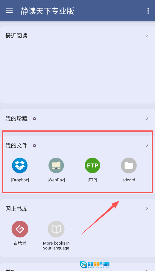 想要开始阅读,你可以通过主界面的“我的文件”入口进入,从中找到存储在手机本地或云盘中的书籍;此外,你也能浏览网上书店,直接获取古腾堡等平台提供的免费优质书籍。