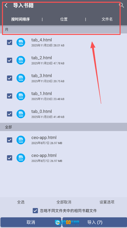 把书添加进来的操作很简单,在导入界面勾选你想阅读的文件就行;要是文件数量较多,使用全选功能会更便捷,最后点击导入按钮,这些书就会显示在你的书架上了。