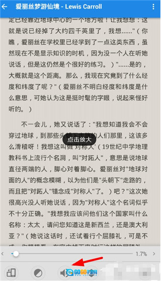 进入“爱丽丝梦游仙境”小说详情页后,轻点屏幕中央调出菜单,接着在下方列表中找到声音按钮并点击,即可完成朗读设置。