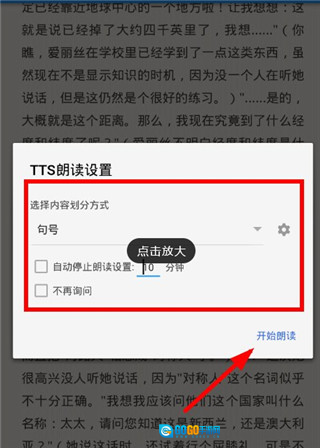用户只需设置好朗读内容的划分方式与停止朗读的时间,就能点击“开始朗读”按钮,让系统朗读该书籍了。
