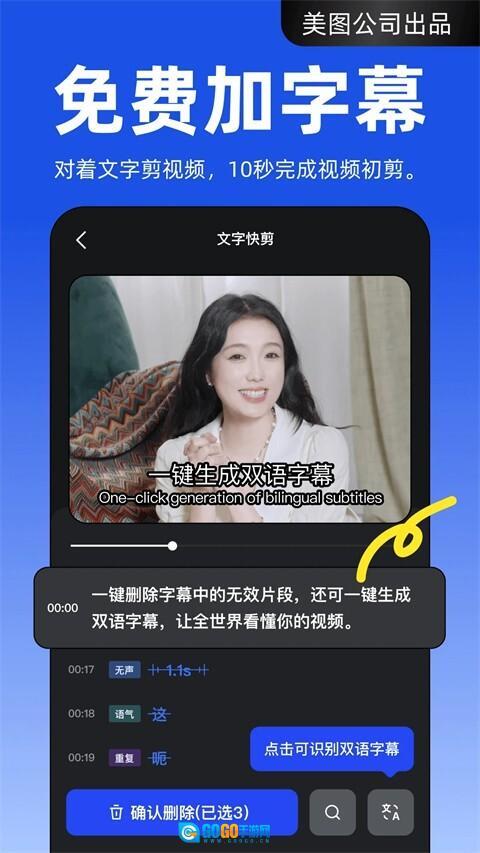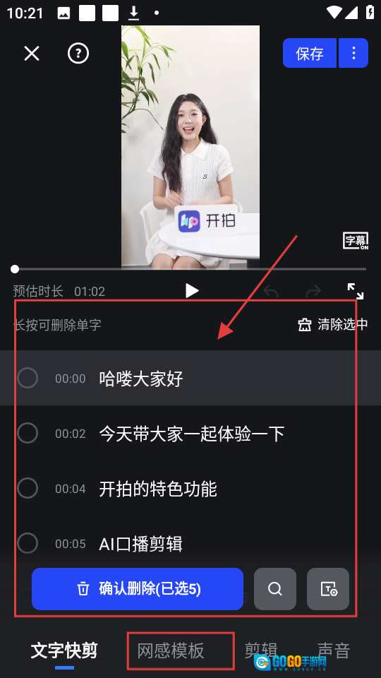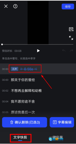 【文字快剪】具备智能识别视频内容的功能,能精准定位语气词、无声片段和重复片段;只需选中这些内容,就能一键删除,助力用户快速提升剪辑效率。