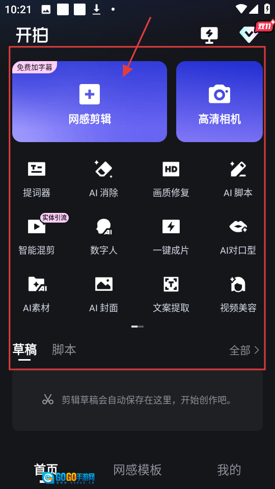 点击【网感剪辑】进入剪辑界面,即可开启网感视频的创作之旅。