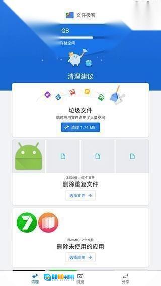 谷歌文件极客(FilesbyGoogle)是由谷歌推出的一款文件管理工具,它可以帮助用户管理手机以及电脑中所有文件,而且软件适用范围非常广泛,兼容性也很强,操作使用方便,能够智能检测手机中未使用的应用、过大文件,还可以帮助用户快速的管理自己的手机中的文件,并且还可以深度的清理用户的手机文件,无论是查找手机图片、视频、音频以及其他文件,都可以使用这款软件进行一键管理,使用非常便捷,快来试试吧!