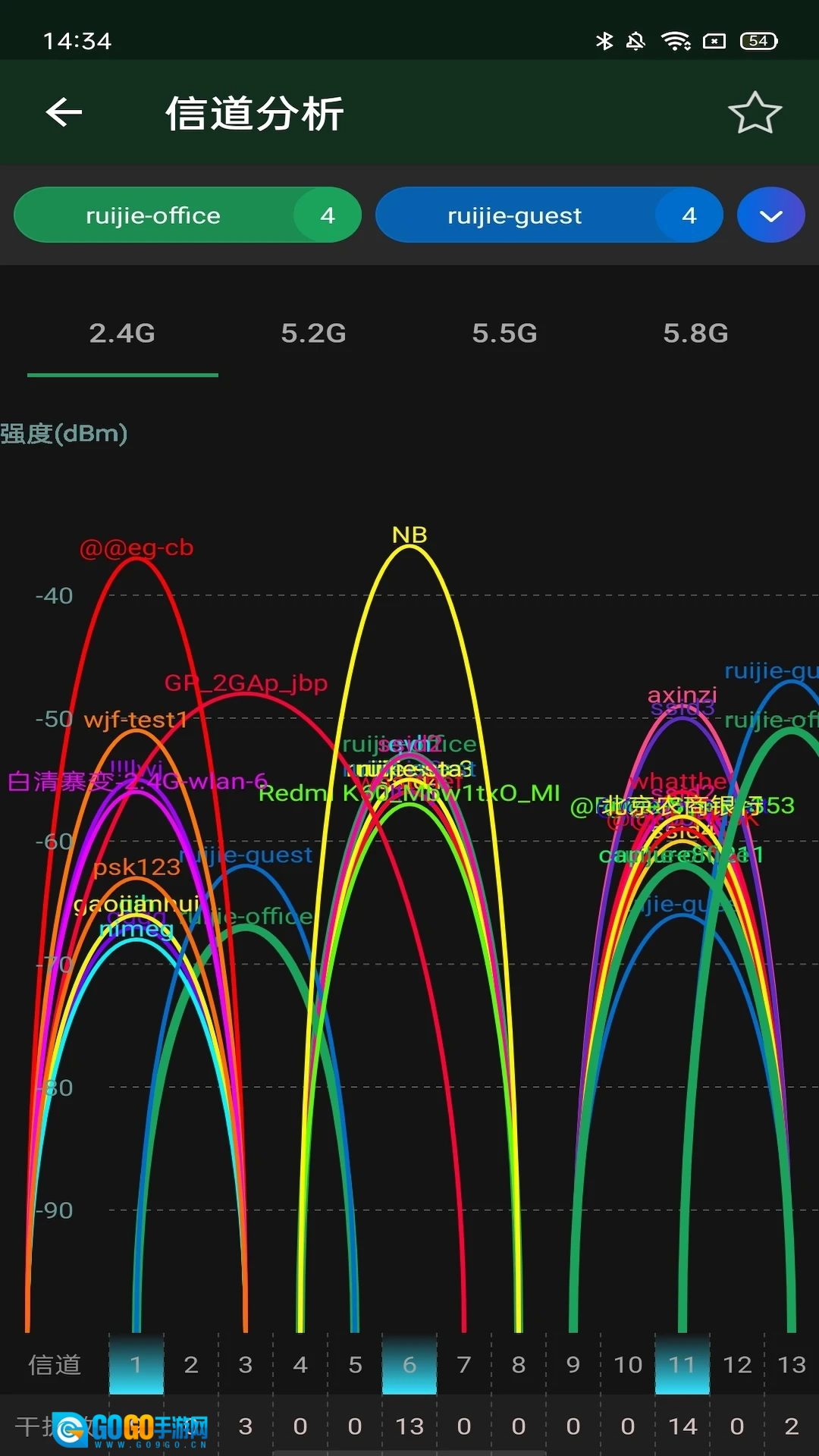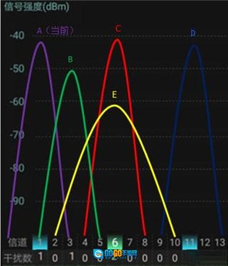 下图魔盒扫描图信道分析结果:A、B、C、E间均存在较大信道干扰