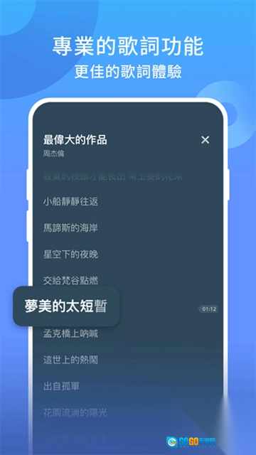 热门歌曲歌词:大量热门歌曲的歌词显示功能,有助于用户更好地理解和记忆旋律,特别适合卡拉OK爱好者使用。