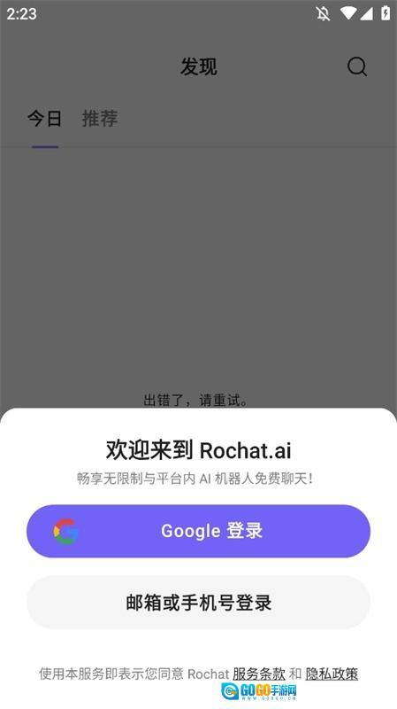 1、rochat支持谷歌登录和电子邮件注册。完全免费使用,没有聊天限制,AI回答非常智能。