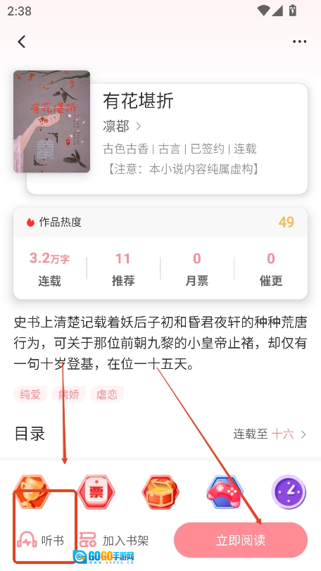 进入喜欢的小说界面,点击立即阅读,可以阅读,点击听书,就可以开始听书啦