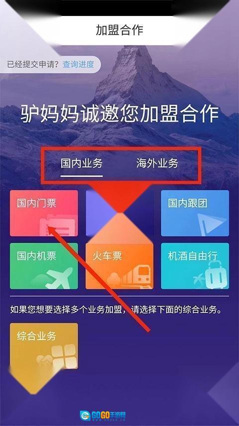 3、进入到加盟合作界面,包括“国内业务”和“海外业务”两大类型,选择需要加盟的业务,这里以“国内门票”为例,