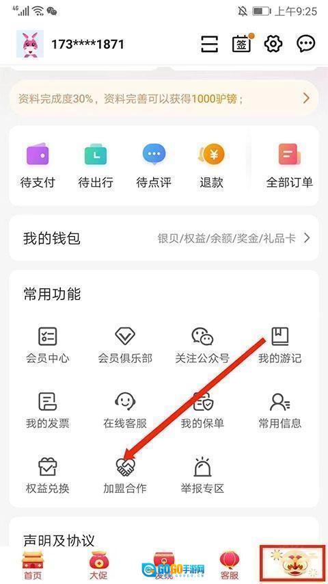 2、进入到用户中心界面,往下滑动,选择“加盟合作”选项,