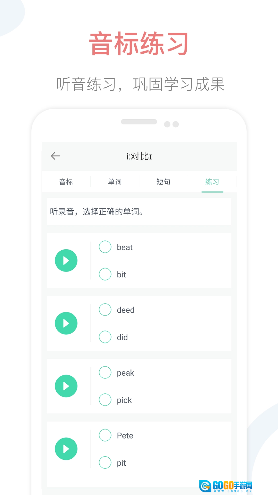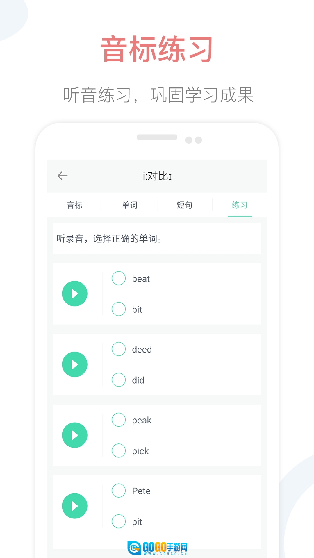 英语音标点读是一款非常好用的英语单词学习软件,你可以通过学练结合的方式跟高效的记忆音标,从而高效掌握英语的基础知识,而且软件中还拥有更纯正的英文口音,帮助用户提高学习效率;并且用户在软件中可以看到各种各样的音标内容,为学习英,包括元音辅音等基础常识,以及各种口型发音和拼写规则等,全方位帮助用户快速巩固课堂学习成果。