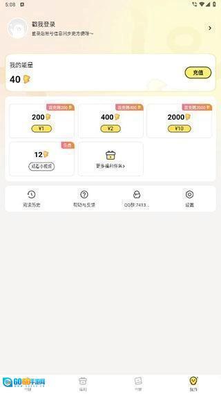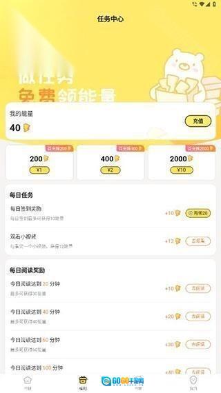 3、福利 点击下方的福利按钮,就能进入福利页面,完成指定任务可获取能量,这些能量可用于解锁小说章节等操作。