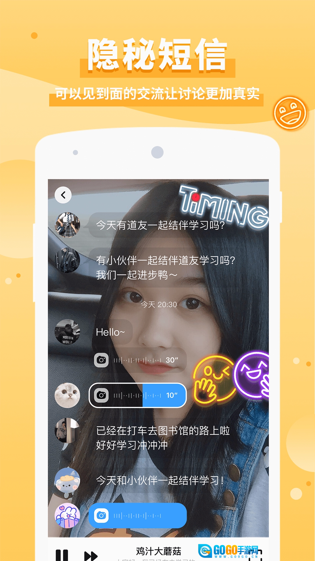 timing软件是一个以社交圈子为形式,鼓励人更努力的读书的软件,在timing软件里,你可以看到来自不同地区的人的学习进度,通过与最优秀的人对比,达到共同进度的目标。正能量爆表的学习社区社交。你想知道哈佛学霸的一天是如何度过的吗?你想知道高考从300分到600分的逆袭学子是如何学习的吗?你想知道3个月瘦40斤的减脂达人是如何安排饮食的吗?你想知道演奏达人是如何训练来克服怯场的吗?你想看看精致的小姐姐们在回寝室后学习时的样子吗?这里有全国最独一无二的正能量学习社区,你可以制作和上传自己的学习Vlog,和志同道合的人一起分享学习生活!