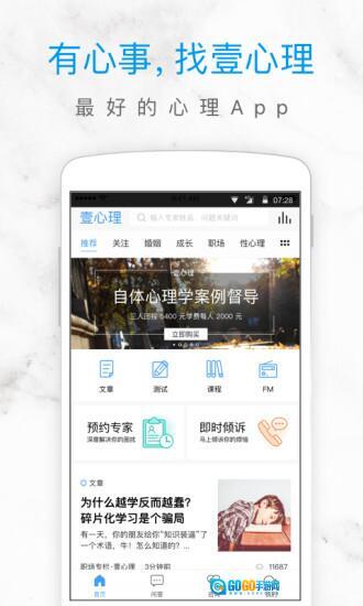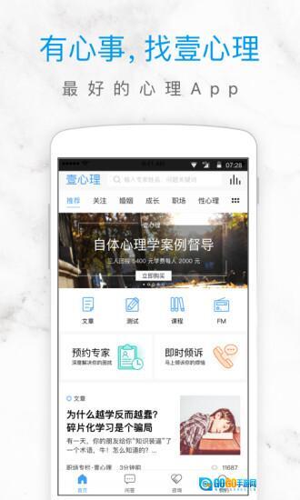 “壹心理”,作为国内处于领先地位的综合心理服务平台,在这里,你能够阅读心理文章、参与心理测试、学习心理课程、收听心理FM,还能提出心理问题并预约心理专家。平台汇聚了国内外5000多位专业心理咨询师,他们将为你化解生活中形形色色的心理问题。与此同时,平台上还有千万网友会免费回应你的提问,陪伴你共同成长!