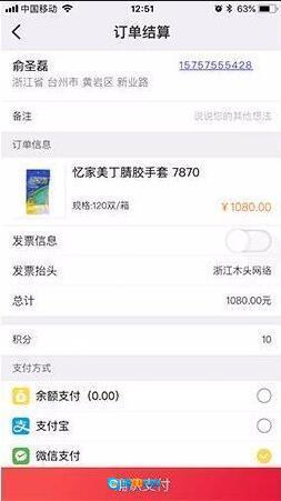 订单结算页面为用户提供了余额支付、支付宝以及微信支付等多种支付方式。