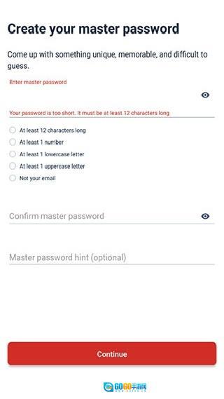 3. 依照要求输入密码完成注册:随后会进入到另一个界面,依据提示将满足要求的密码输入两次(密码最少12个字符,要包含数字、大小写字母,并且不能是邮箱地址),接着点击“continue”就可以了。