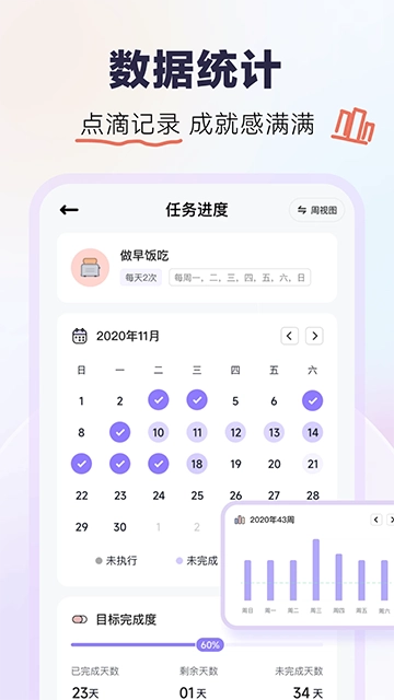 多维度习惯数据呈现,快速了解每个目标坚持的天数及完成情况,见证每天进步,收获满满成就。