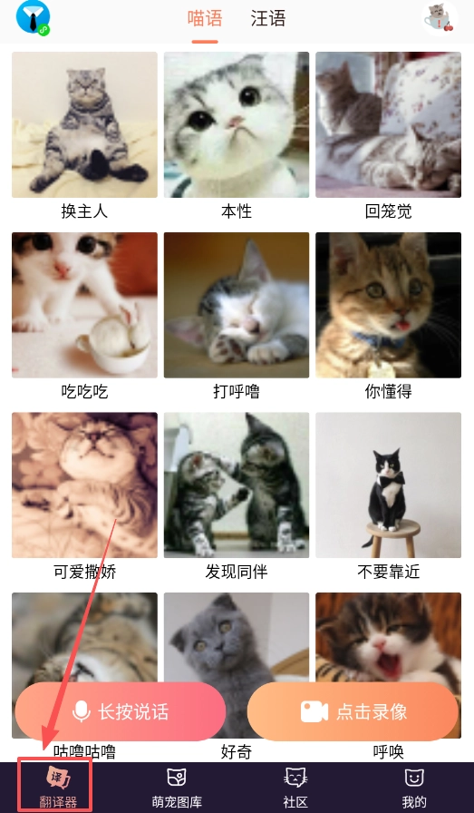 要开启翻译功能,需先进入“翻译器”板块,接着选择喵星人或汪星人语言模式,之后长按录音按钮来采集宠物的叫声。