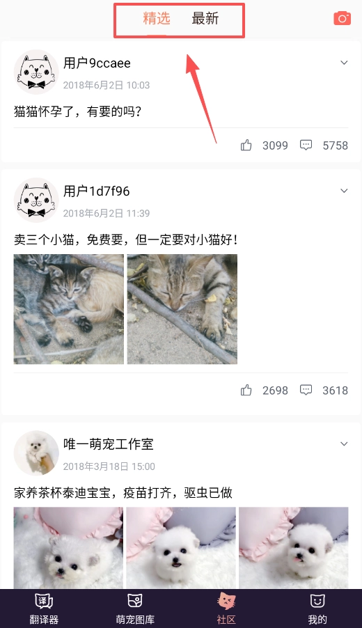 社区板块设有“精选”和“最新”两条时间线,用户能够查看宠物领养信息、养护心得交流等由用户生成的内容。