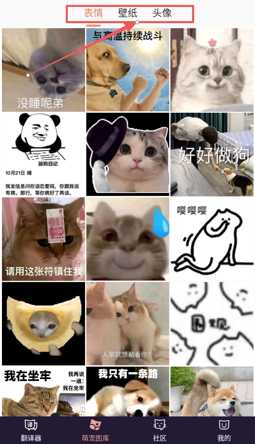 萌宠图库运用卡片式瀑布流布局,包含表情包、手机壁纸、社交头像三种素材类型,具备即点即存的便捷功能。