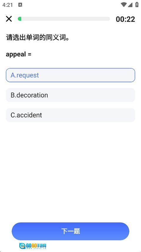 3、如果对背单词感到枯燥,点击首页的在线测评,系统出题检测提升水平;