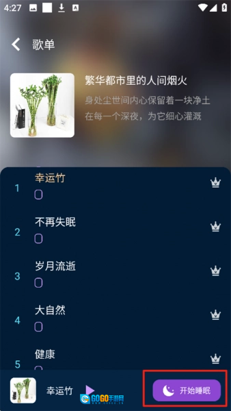 5、点击第三步图中的助眠音乐,随后进入该图所示,选择音乐,最后点击右下角开始睡眠。