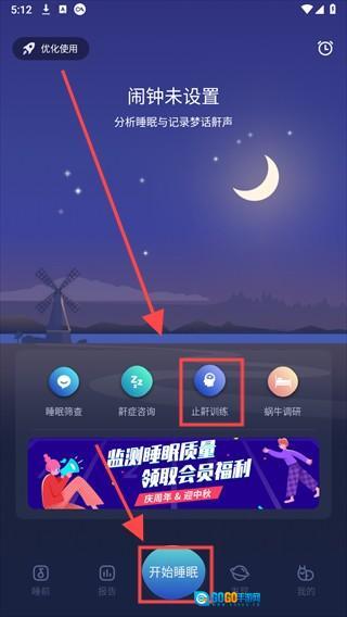 1、首先访问下方【开始睡眠】界面,点击止鼾训练功能、