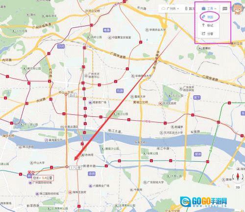 4、打开百度地图网页,点击右上角的工具——测距,就可以在百度地图上通过点与点之间的连接测量两点之间的距离。