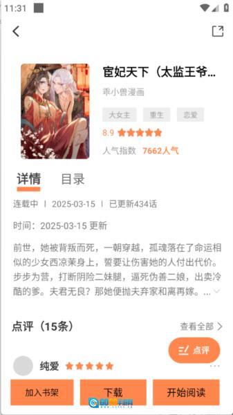 4、点开喜欢的漫画进入详情页后,可以将其加入书架、或直接开始阅读。
