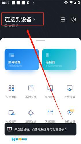 1、初次进入,在投屏之前我们需要先新建电视与手机设备的连接,在下图所示位置点击“连接到设备”添加自己的电视设备。
