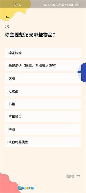 成功登录软件后,进入主界面,首先选择您主要想记录的物品类型,确认选择后点击“继续”按钮,进入下一步操作。