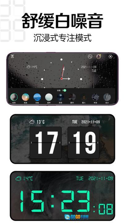 换个喜欢的皮肤,会不会更喜欢打开App,迫不及待开始今天的任务呢?科技、星空、自然、艺术、复古、四季、暗黑、清新等各种风格及分类的数字时钟和模拟时钟皮肤,等你来挑!