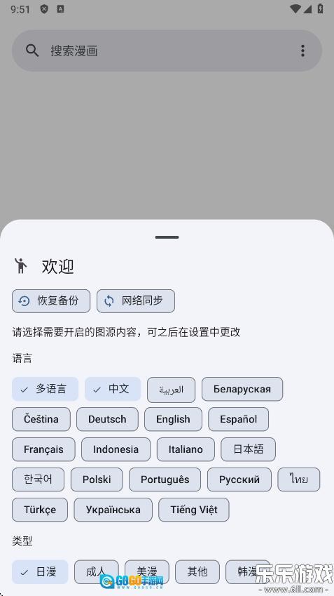 4.添加的漫画源有很多注意,选择语言,英文可以搭配漫画翻译软件一起操作。