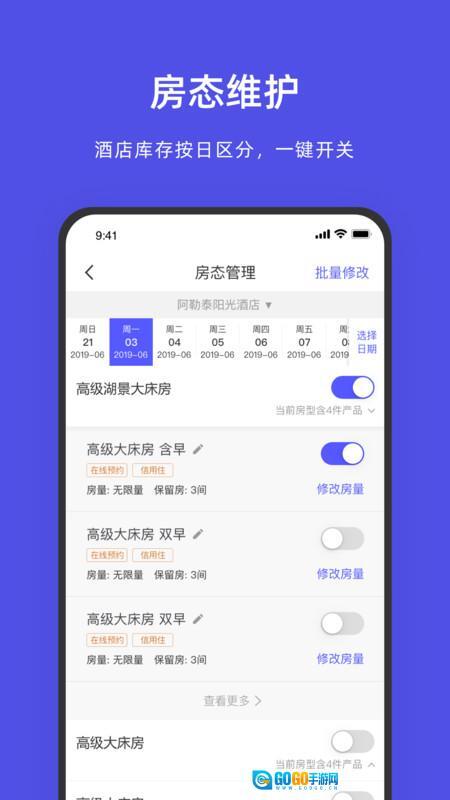 4、房态管理界面可按日期选择查看和调整不同房型的销售状态,支持一键上下架房量及批量修改房价与库存。