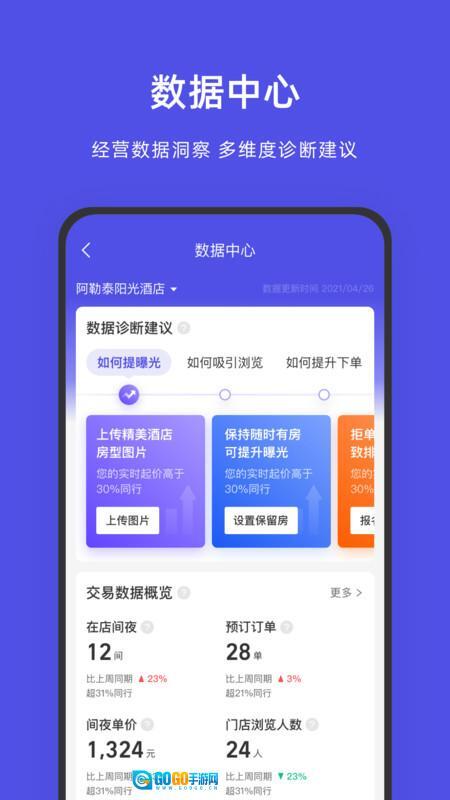 1.数据分析与洞察:提供详细的经营数据报告,包括入住率、平均房价、收益走势等关键指标,助力商家精准决策。