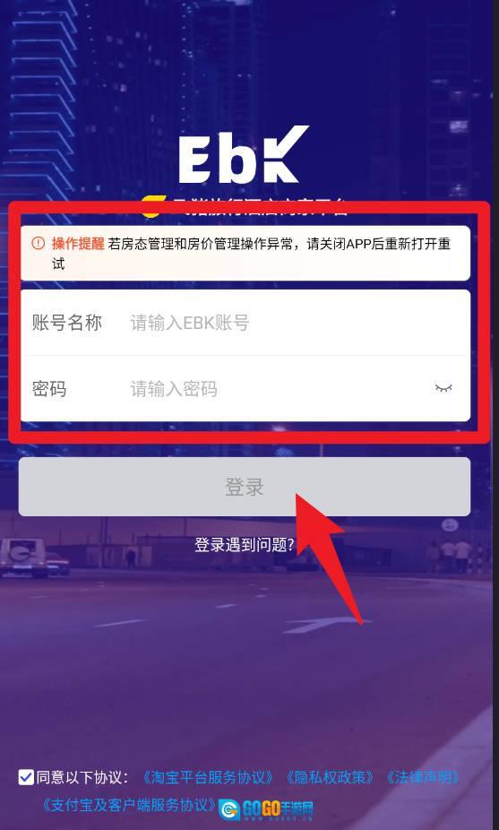 1、登录页面中,输入正确的EBK账号与密码后点击登录按钮,若出现房态或房价管理异常提示,请关闭重新启动再尝试。