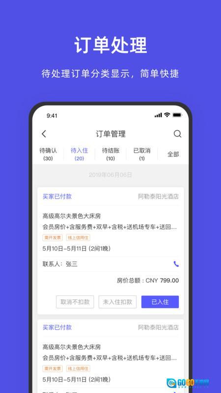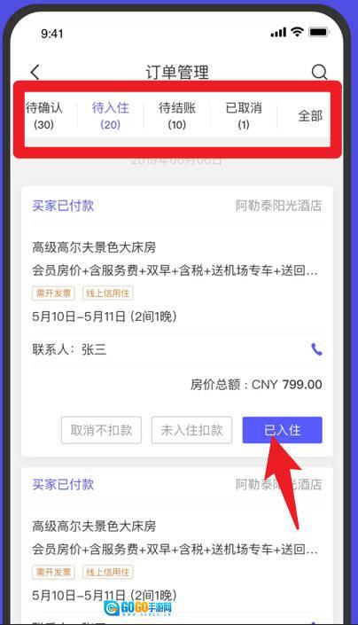 3、订单管理界面提供待确认、待入住、待结账、已取消等分类,可根据订单状态快速操作,点击“已入住”按钮完成入住登记。