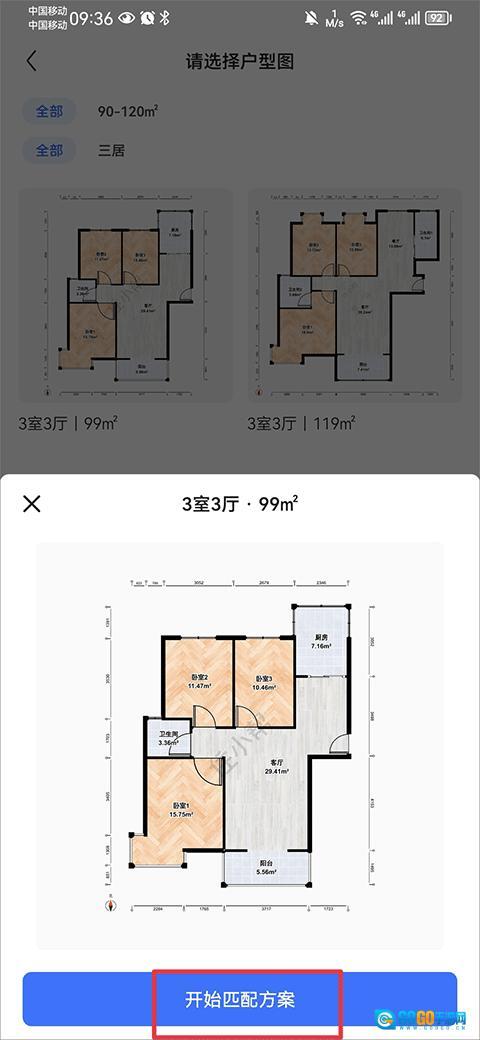 4、输入小区名称后会进入户型的选择,选择后点击开始配案