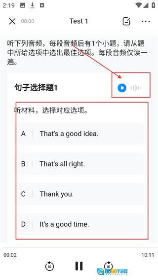 进入Test1练习后,点击音频播放按钮听取内容,再从选项中选择对应答案,完成听力题的作答。