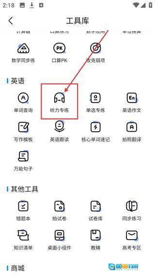 在工具库界面找到【听力专练】的功能入口并点击,进入英语听力练习专区后,即可开启听力训练。