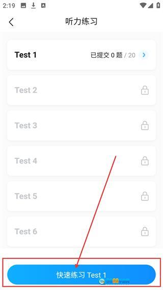 在听力练习页面,点击【快速练习Test1】按钮,就能开启这套听力题的训练,一步步完成题目啦。