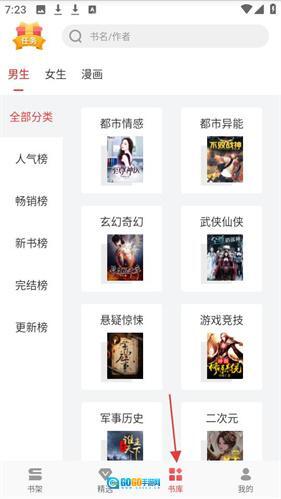 3、点击书库页面,有搜索栏与任务标识,分男女、漫画等类别,展示全部分类榜单及书籍封面。