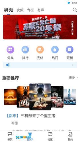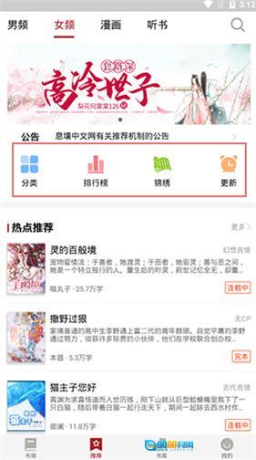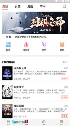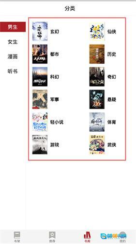 2、在推荐区域,设有男频、女频、漫画、听书、分类、排行榜等板块。