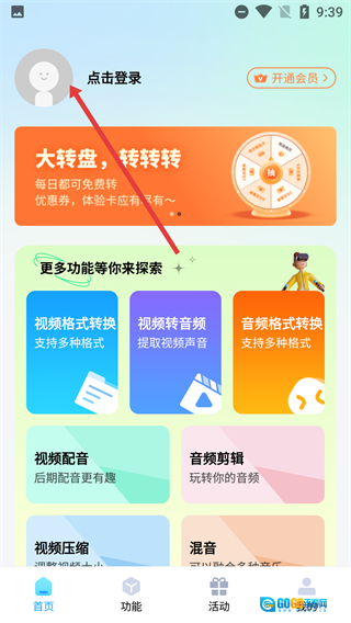 2、在首页点击头像区域的【点击登录】按钮,该页面还提供【视频格式转换-支持多种格式】等功能选项。