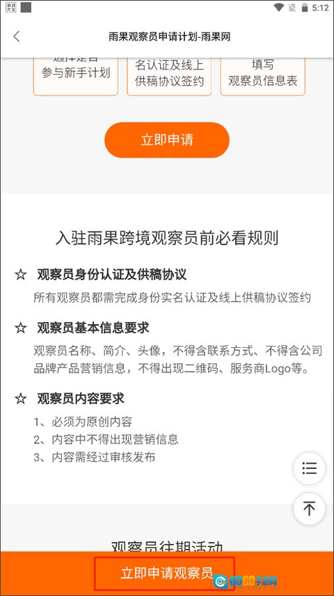 2、在你入驻雨果跨境观察员之前需要了解的规则以及往期活动,明白这项职责所要工作的范围是什么之后,就可以“立即申请观察员”了。