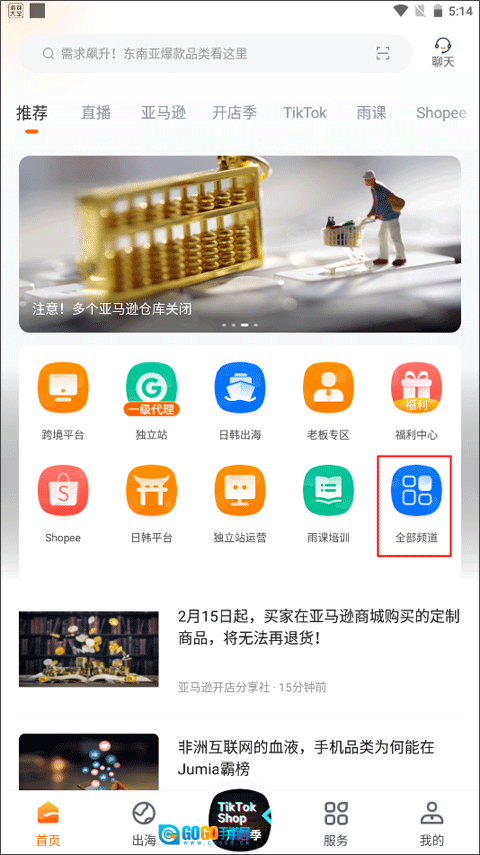 1、首页的功能包含了跨境平台、独立战、日韩出海、老板专区等,进入【首页->全部频道】。